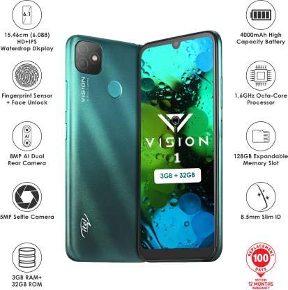 General In The Box Handset, Power Adapter, Data Cable, User Manual, Warranty Card Model Number L6005 Model Name Vision1 Color Gradation Green Browse Type Smartphones SIM Type Dual Sim Hybrid Sim Slot No Touchscreen Yes OTG Compatible Yes SAR Value Head: 0.304 W/kg, Body: 1.380 W/kg Display Features Display Size 15.46 cm (6.088 inch) Resolution 1560 x 720 Pixels Resolution Type HD+ Display Type HD+ Incell TFT Display Other Display Features 19.5:9 Aspect Ratio with 500 Nits Brightness, Full laminated 2.5D incell Os & Processor Features Operating System Android Pie 9 Processor Type Unisoc SC9863A Octa Core Processor Core Octa Core Primary Clock Speed 1.6 GHz Operating Frequency GSM: B3, B8, WCDMA: B1, B5, B8, 4G LTE: B1, B3, B5, B8, B40, B41 Memory & Storage Features Internal Storage 32 GB RAM 3 GB Expandable Storage 128 GB Supported Memory Card Type microSD Memory Card Slot Type Dedicated Slot Call Log Memory Yes Camera Features Primary Camera Available Yes Primary Camera 8MP + 0.3MP Primary Camera Features 8MP AF Main Camera, VGA (0.3MP) Assistant Camera, AI Dual Rear Camera, Portrait Mode, Smart Recognition, AI Beauty Mode, HDR Mode, Pro Mode, Pano Mode, Low Light Mode, Short Video Secondary Camera Available Yes Secondary Camera 5MP Front Camera Secondary Camera Features 5MP Front Camera, 1.4μm Pixels, f/2.0 Aperture, AI Beauty Mode, AR Stickers and Filters Flash Rear Dual LED Flash Video Recording Yes Digital Zoom Yes Dual Camera Lens Primary Camera Call Features Phone Book Yes Connectivity Features Network Type 4G, 3G, 2G Supported Networks 4G LTE, WCDMA, GSM Internet Connectivity 4G, 3G, Wi-Fi, EDGE, GPRS GPRS Yes Pre-installed Browser Google Chrome Bluetooth Support Yes Bluetooth Version v4.2 Wi-Fi Yes Wi-Fi Version 802.11 b/g/n Wi-Fi Hotspot Yes NFC No Infrared No USB Connectivity Yes EDGE Yes Audio Jack 3.5mm Map Support Google Maps GPS Support Yes Other Details Smartphone Yes SIM Size Nano + Nano SMS Yes Graphics PPI 282 PPI Sensors Fingerprint, G Sensor, Pro